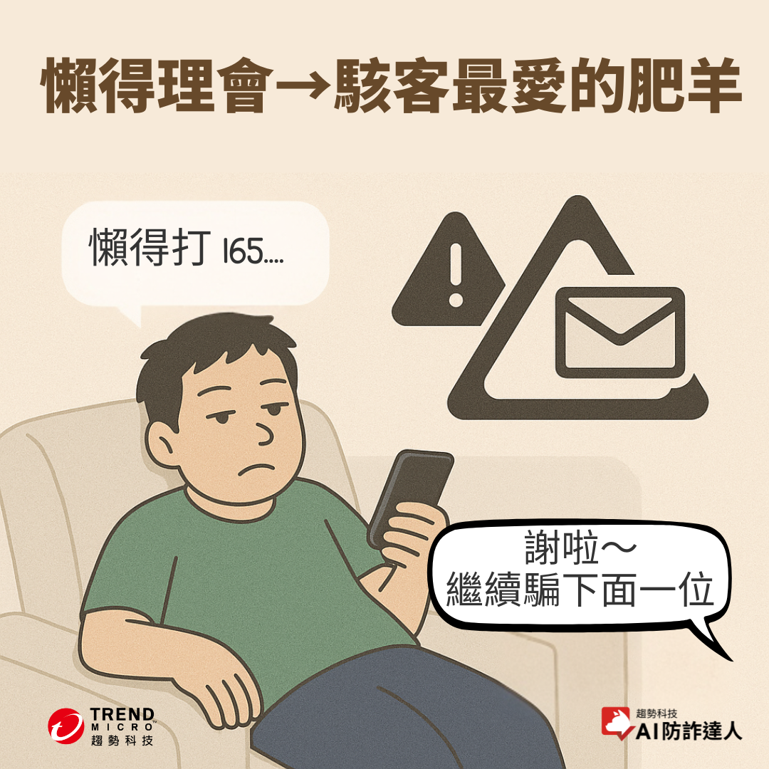 在這個人人都想耍廢的懶人節,我們可以選擇對生活懶一點,對詐騙卻要精明一點。因為詐騙集團最愛的,就是那種自認不會被騙、懶得查證、懶得學習、懶得理會的「躺平懶人」。你的一時鬆懈,可能就是他們入侵你帳戶、盜用你身份的最佳機會。