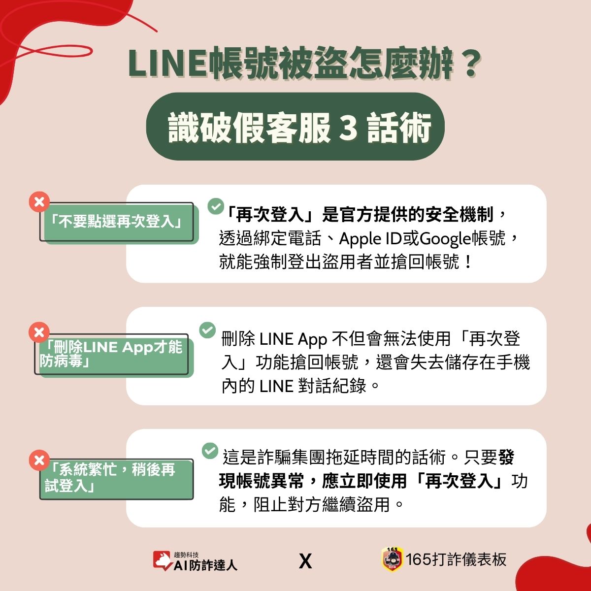 這是典型的恐嚇話術。警方指出,LINE本身並不容易中毒,刪除App並不會防毒,反而會讓你失去搶回帳號的機會,更可能刪掉重要的犯罪證據。