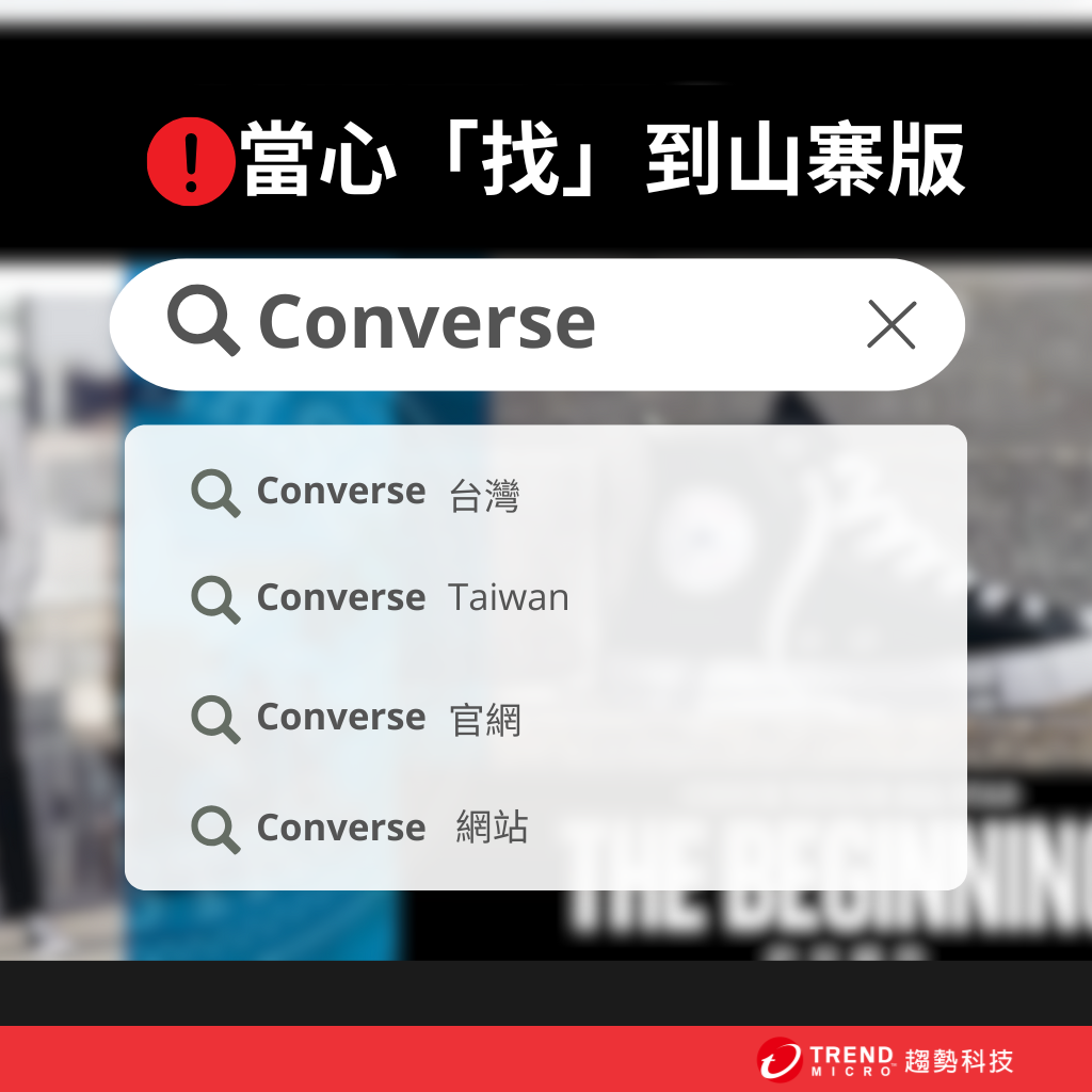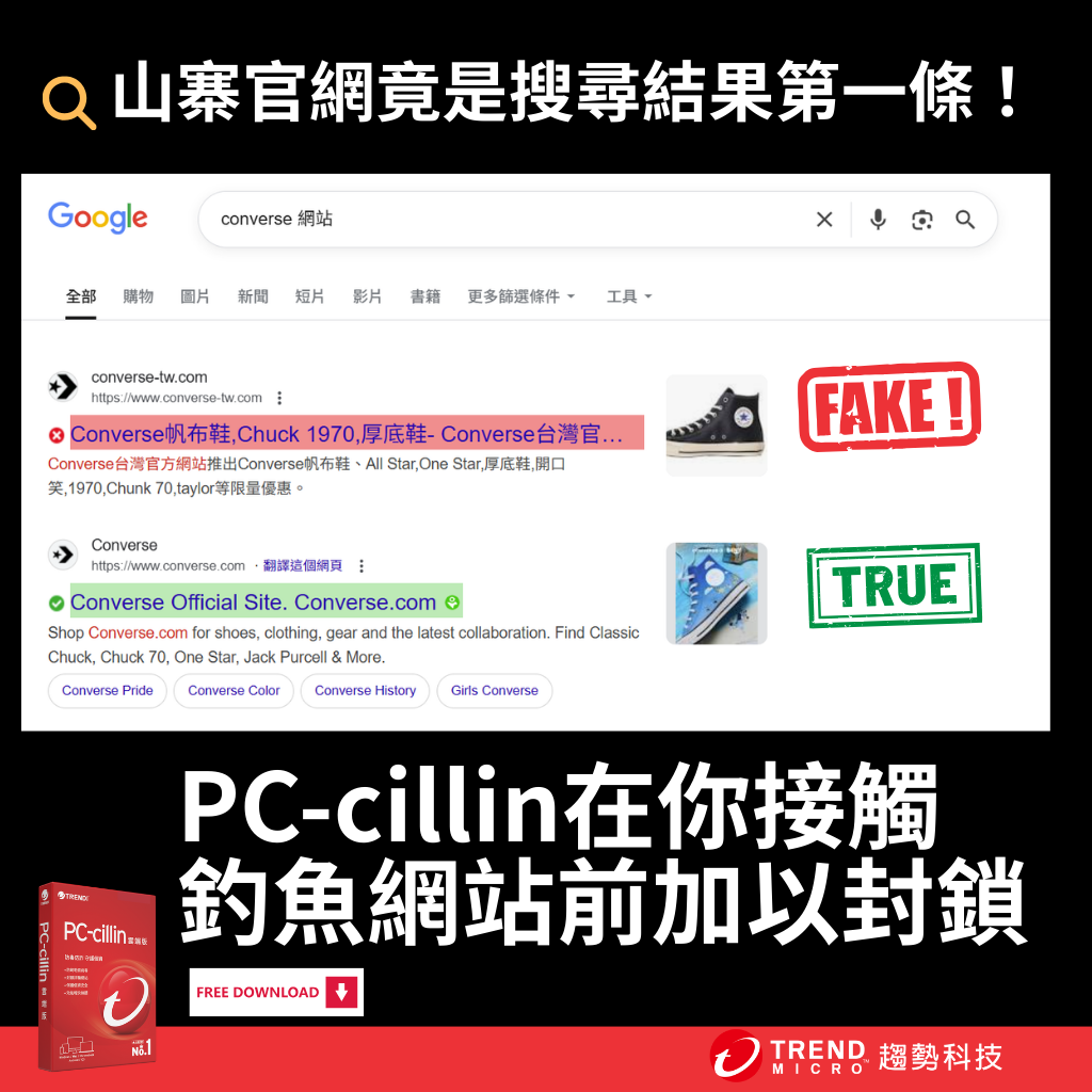 - 消費者經常搜尋「Converse 官網」時,仿冒網站因搜尋引擎優化( SEO) 技術,使得搜尋結果名列前茅,容易誤導人點擊購買。