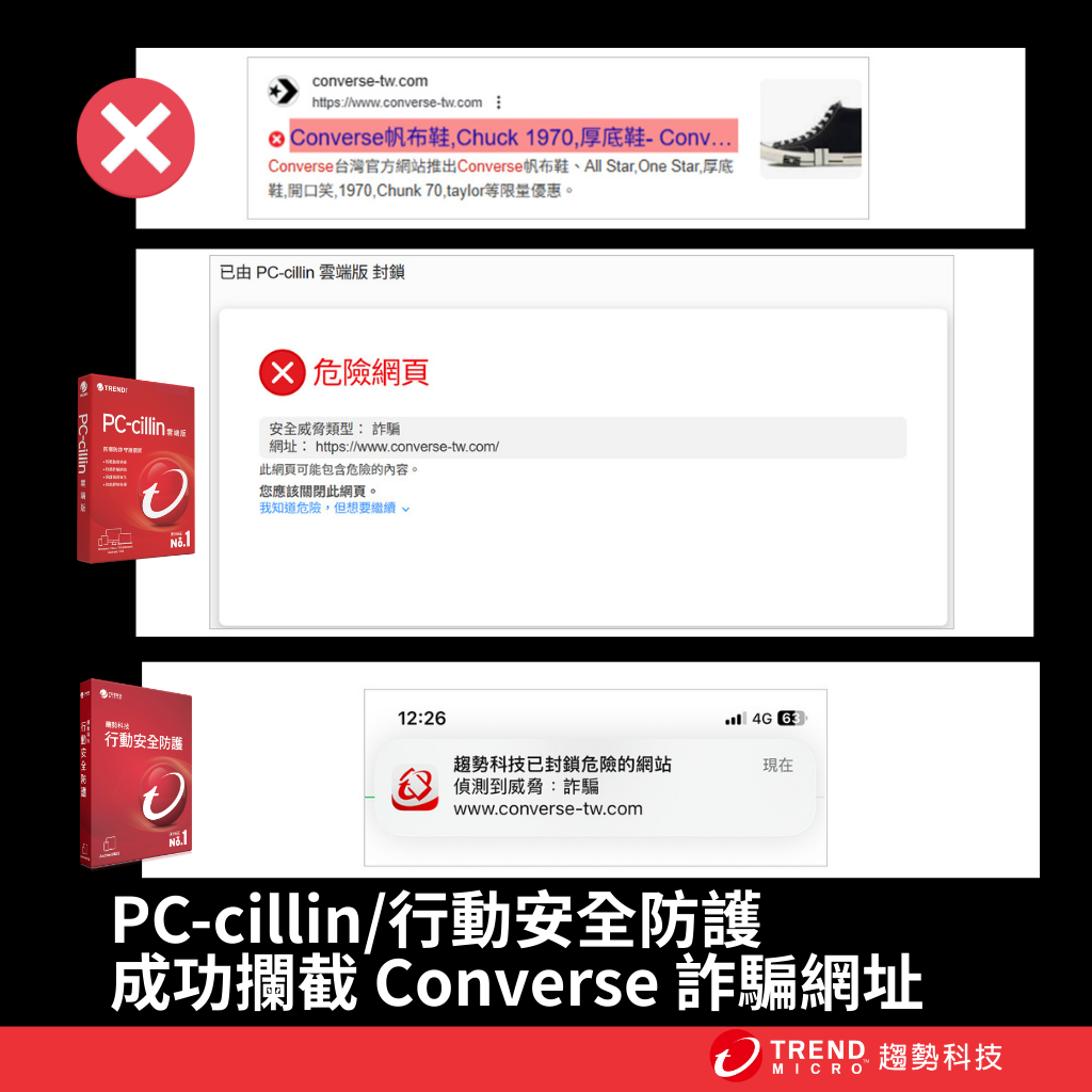更令人意外的是,這些假網站不只外觀高仿,連 Google 搜尋「Converse 官網」時,第一名的結果竟然就是假的官網!許多消費者因此誤以為是真正的官方通路,直接下單,最後才發現進入了詐騙集團設下的陷阱。