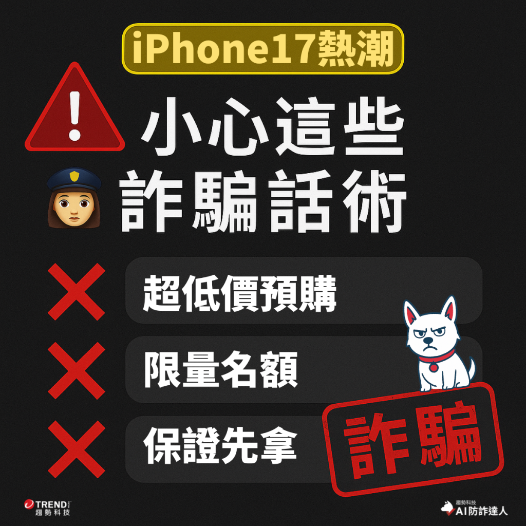 近期,蘋果最新發表的 iPhone 17 系列與 iPhone Air 掀起搶購熱潮,台灣官網及三大電信預購名額在數分鐘內就被秒殺。這股驚人的買氣也引來詐騙集團的注意,他們利用「超低價預購」、「限量名額」和「保證先拿」等話術,誘騙民眾上當。