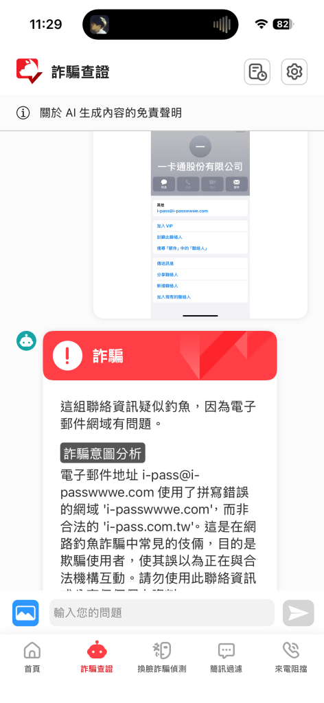 另外,針對顯示「一卡通股份有限公司」的寄件者資料,AI防詐達人警告電子郵件地址 i-passwwe.com ,使用了拼寫錯誤的網域 而非合法的 i-pass.com.tw。這是網路釣魚詐騙中常見的伎倆,目的是欺騙使用者,使其誤以為正在與合法機構互動。請勿使用此聯絡資訊或分享任何個人資料。