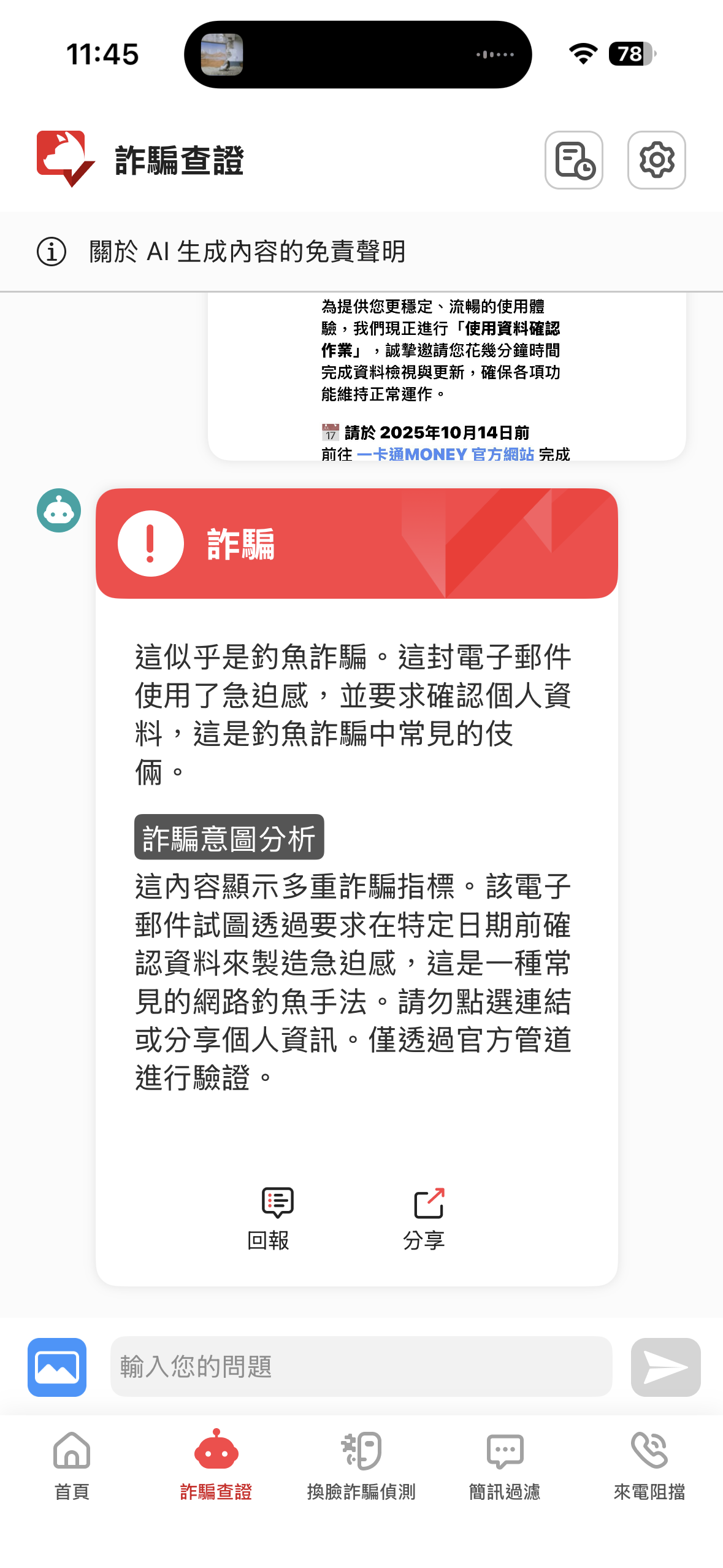 詐騙查證: 允許用戶將可疑簡訊截圖或直接複製貼上文字,利用AI進行分析來判斷是否為詐騙訊息。